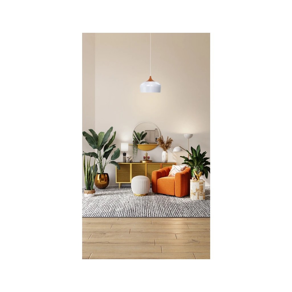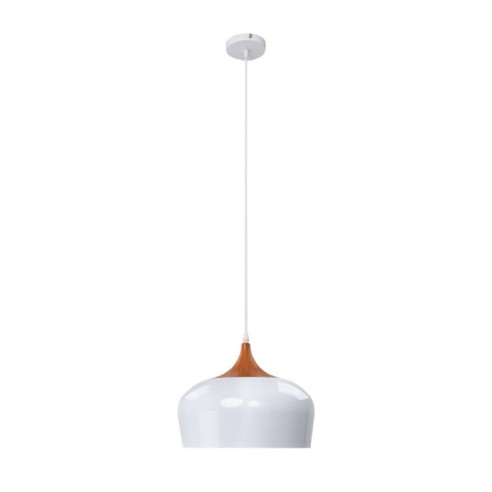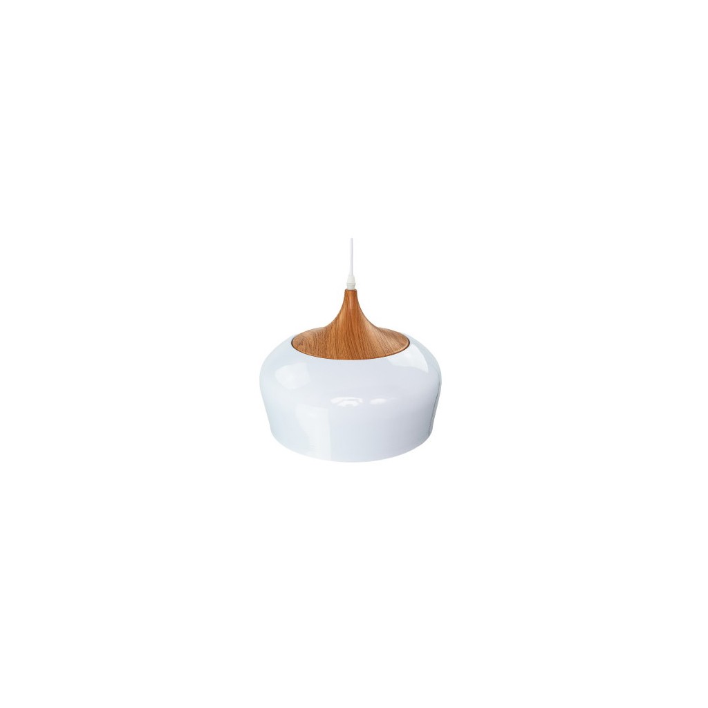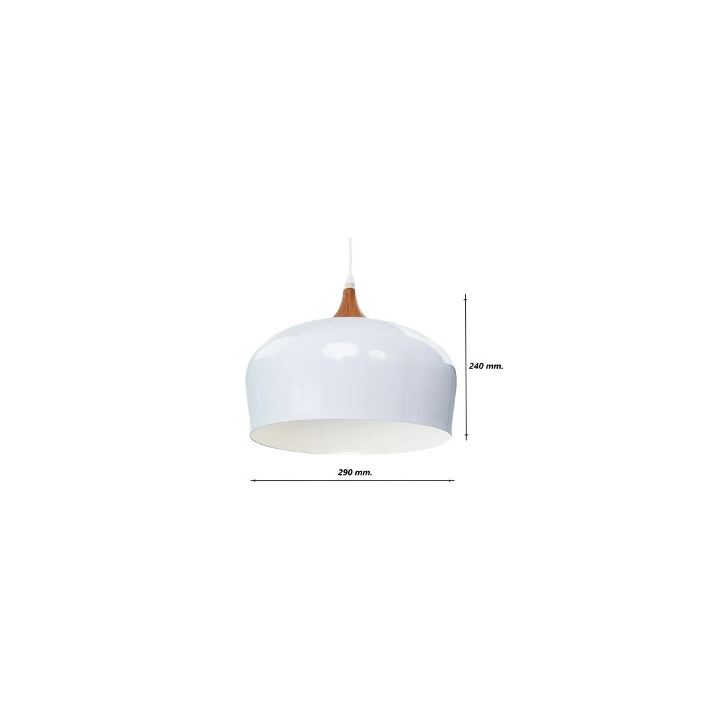 Пенделът Белеза впечатлява с минималистичната си визия, подчертанa от матово бяло покритие и естествено дървено докосване в горната част на корпуса. Тази комбинация придава характер и топлина на осветлението, превръщайки го в акцентен елемент във всяко помещение. Стоманената конструкция с прахово боядисване гарантира устойчивост и дълъг живот на продукта, а отворената форма на разсейвателя осигурява приятна и равномерна светлина.