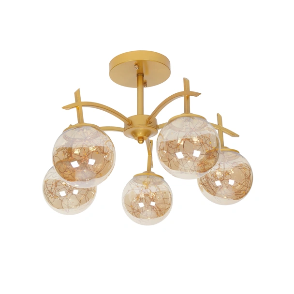 Полилеят впечатлява със своите пет стъклени абажура, всеки от които има деликатни декоративни елементи във вътрешността, напомнящи тънки златисти нишки. Тази детайлност създава уникална игра на светлината, която нежно се разсейва в помещението. Металната конструкция в златисто придава стабилност и завършен вид, подчертавайки премиум усещането на полилея.