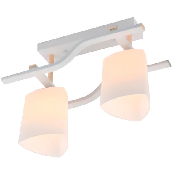 Изработен е от месинг и е снабден с два стъклени плафона в бял цвят.