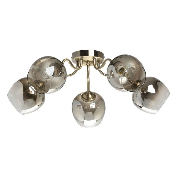 Полилей Iren се отличава с пет изящни опушени стъклени чашки, които разпръскват мека, нежна светлина и създават приятна обстановка. Античният месингов оттенък на металната конструкция придава завършен и премиум вид, а комбинацията от двете текстури създава балансиран, декоративен акцент във всяка стая. Този тип осветително тяло е идеален за хора, които търсят изразителен, но ненатрапчив елемент в интериора.