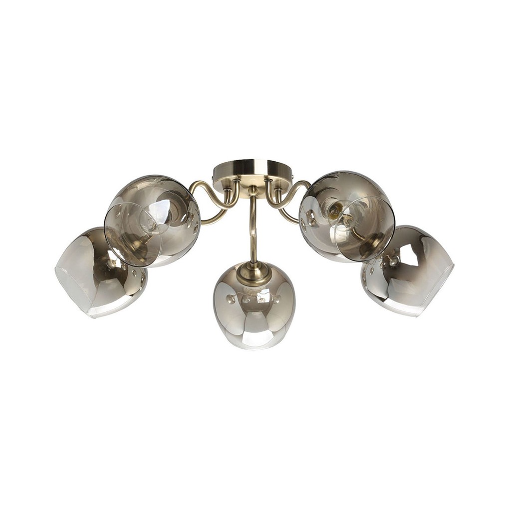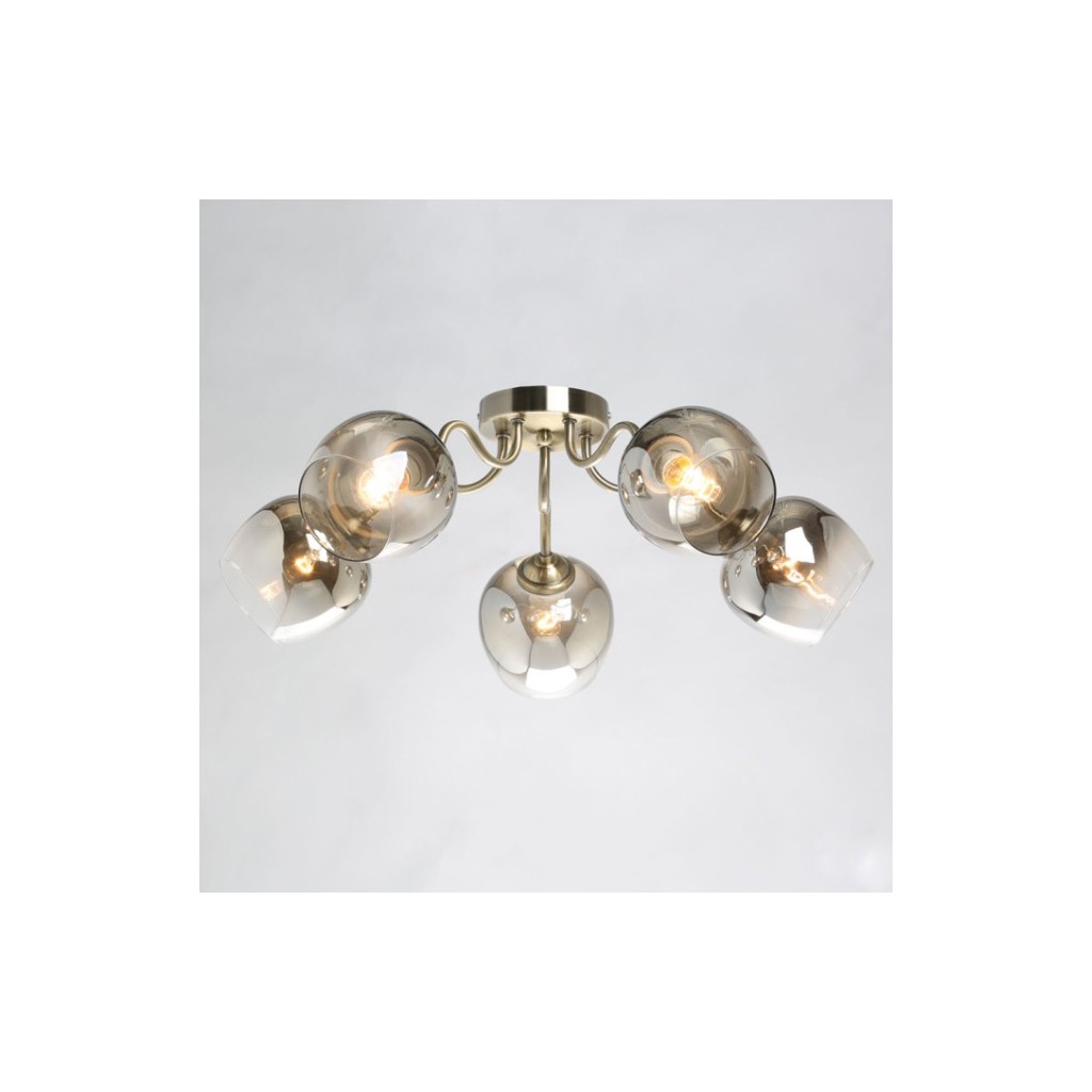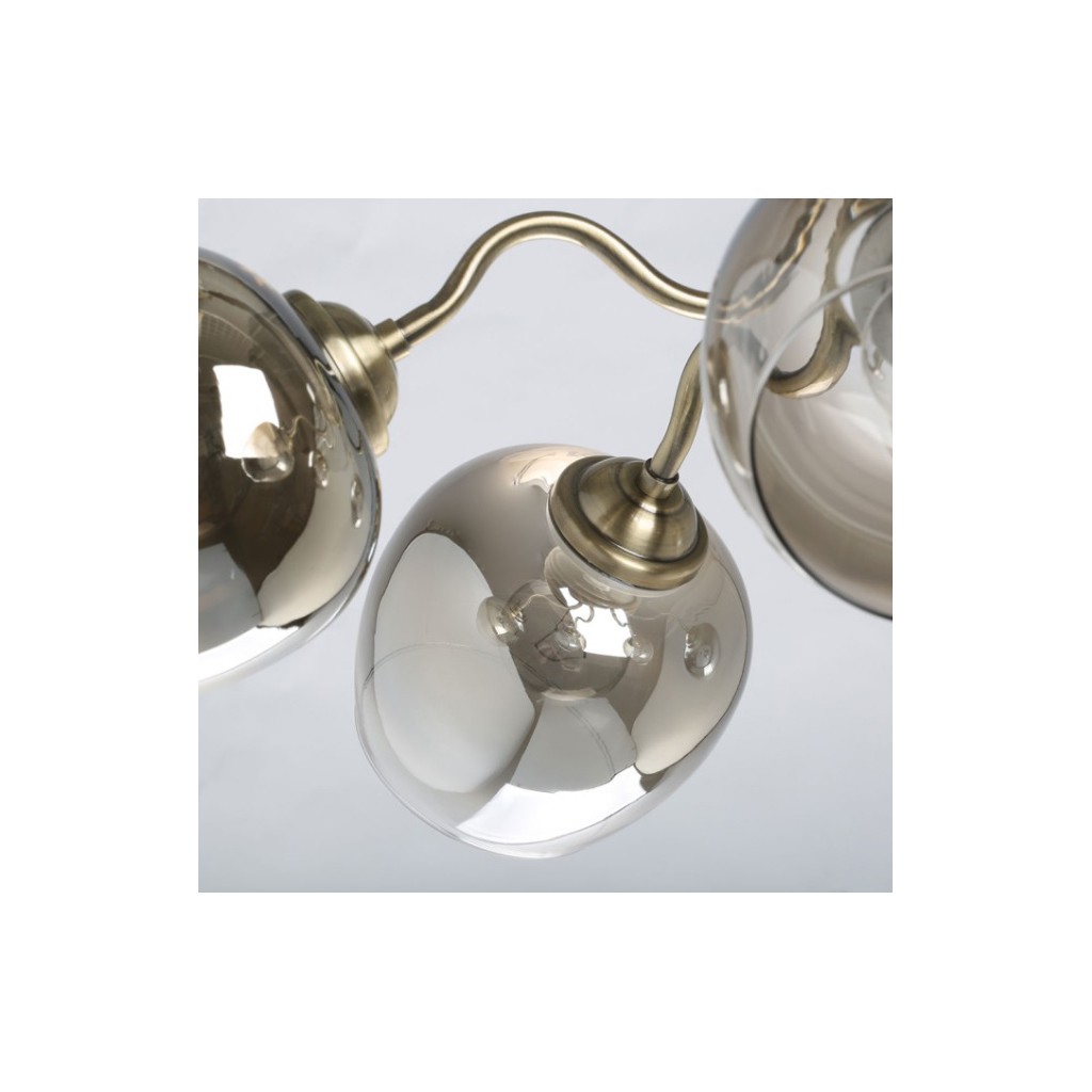 Полилей Iren се отличава с пет изящни опушени стъклени чашки, които разпръскват мека, нежна светлина и създават приятна обстановка. Античният месингов оттенък на металната конструкция придава завършен и премиум вид, а комбинацията от двете текстури създава балансиран, декоративен акцент във всяка стая. Този тип осветително тяло е идеален за хора, които търсят изразителен, но ненатрапчив елемент в интериора.