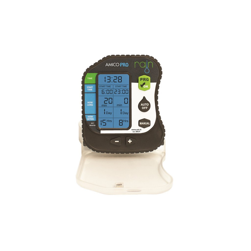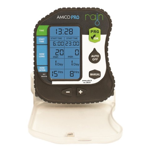 Програматорът за поливни системи Amico PRO е надеждно и интелигентно решение за автоматично напояване на градини и дворове. Моделът е лесен за настройка и позволява прецизен контрол върху времето, честотата и продължителността на поливането, осигурявайки здравословен растеж на растенията и оптимална употреба на водата.