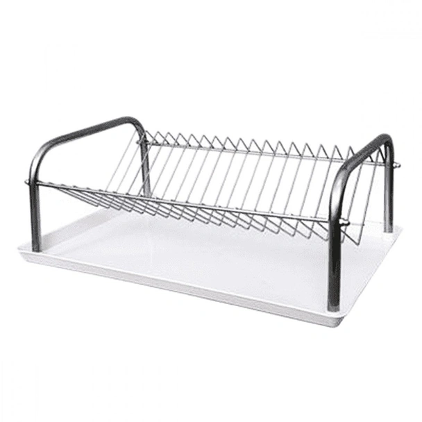 Метален сушилник за съдове с едно ниво и табла за събиране на водата.