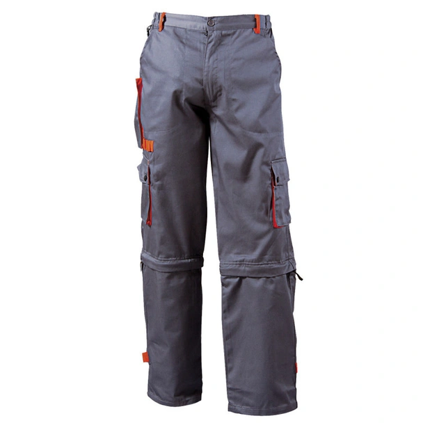 Функционален работен панталон, който е произведен с обемни джобове и свалящи се крачоли. Изработен е от памук и полиестер в сив цвят, гарниран с оранжев цвят.