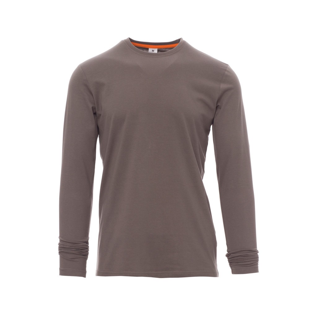 Мъжка тениска с дълъг ръкав, обло деколте и ластична лента с ширина 1.5 см.. Контрастираща лента за укрепване от рамо до рамо, видима от вътрешната страна на яката. Изработена е с еластични шевове, което ги предпазва от порене. Произведена е от 100% висококачествен памук.