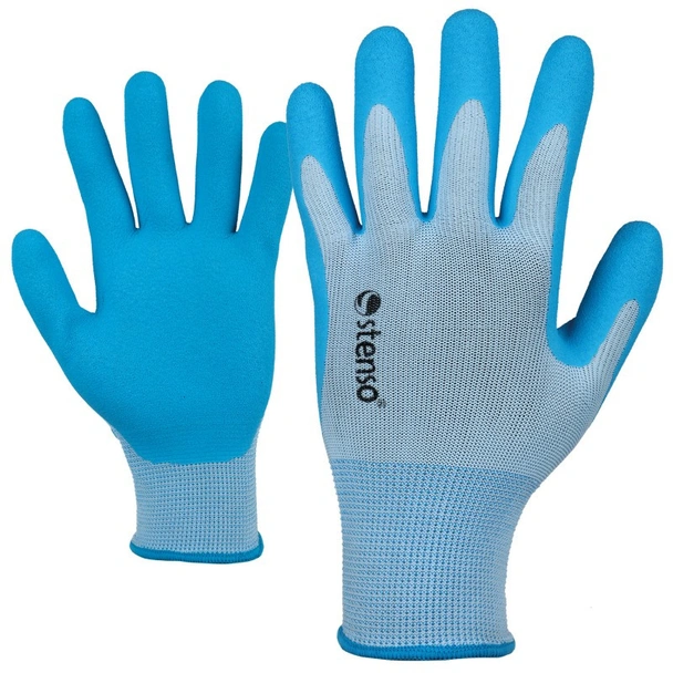 Дамски ръкавици, изработени от плетено безшевно полиестерно трико 13G. Длан и пръсти топени в латекс, дишащ гръб, eластичен маншет.