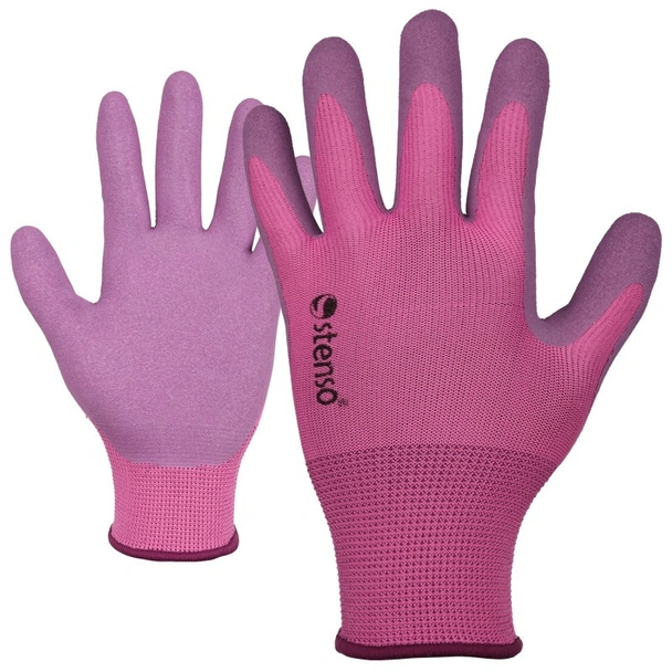 Дамски ръкавици, изработени от плетено безшевно полиестерно трико 13G. Длан и пръсти топени в латекс, дишащ гръб, eластичен маншет.