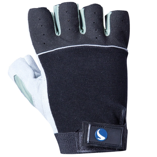 Ръкавици без пръсти, изработени от фина бяла ярешка кожа на дланта, гръб и пръсти изработени от черно памучно трико, набран ластик в областта на китката.