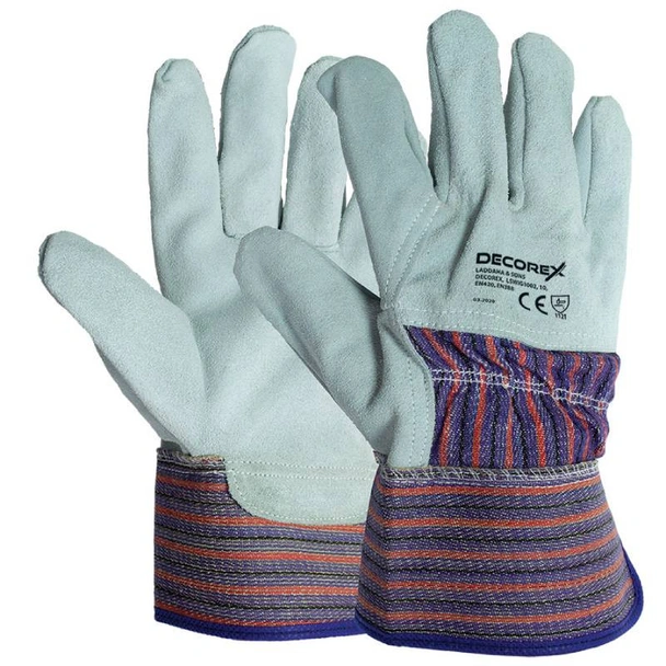 Ръкавици DECOREX са изработени от цепена телешка кожа, имат памучен гръб и подплата, както и подсилен маншет. Кожени ръкавици DECOREX са със стандартен размер L/10", сиви на цвят. Подходящи са за работа в дома и строителството.