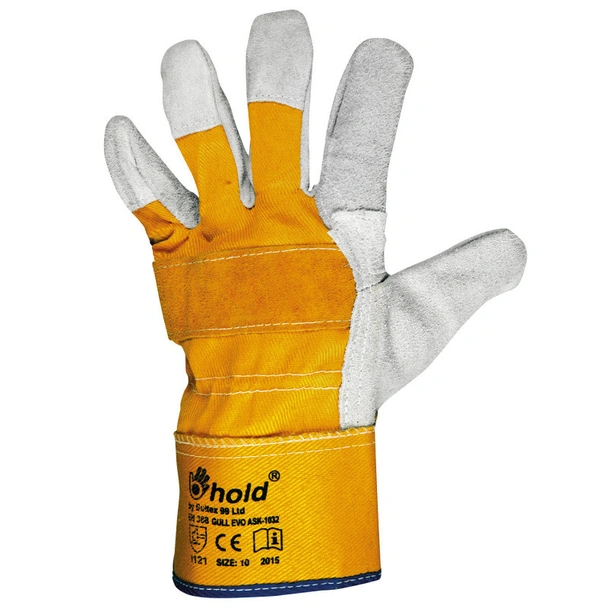 Ръкавици, изработени от сива телешка кожа, подсилени в областта на дланта и пръстите, памучен гръб.