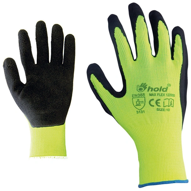 Ръкавици с пет пръста, изработени от полиамидно еластично трико, потопени в микропореста латексова пяна, отлична паро-пропускливост, много добро сцепление при суха, мокра и мазна среда.