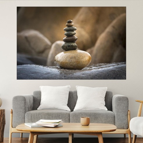 Декорация за стена (картина, пано) с мотив "Баланс от камъни 2 - картина пано за стена". Изработена от олекотено PVC с дебелина 5 мм или канава от 100% памук, опъната върху дървена подрамка с дебелина 5 см. Изображението се печата с висококачествен UV печат, което е гаранция за запазване на цветовете с години!