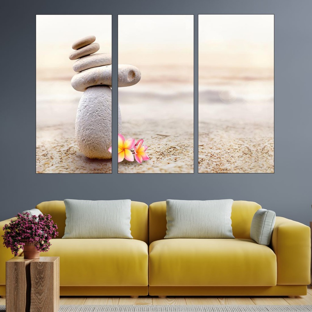Декорация за стена (картина, пано) с мотив "Баланс от камъни и цвете - картина пано за стена". Изработена от олекотено PVC с дебелина 5 мм или канава от 100% памук, опъната върху дървена подрамка с дебелина 5 см. Изображението се печата с висококачествен UV печат, което е гаранция за запазване на цветовете с години!