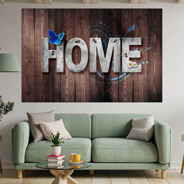 Декорация за стена (картина, пано) с мотив "Декорация HOME на дървен фон - картина пано за стена". Изработена от олекотено PVC с дебелина 5 мм или канава от 100% памук, опъната върху дървена подрамка с дебелина 5 см. Изображението се печата с висококачествен UV печат, което е гаранция за запазване на цветовете с години!