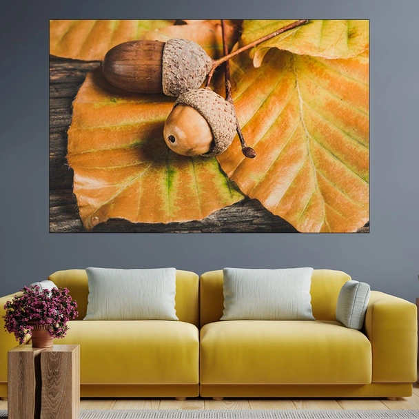 Декорация за стена (картина, пано) с мотив "Есенна декорация с жълъди пано за стена". Изработена от олекотено PVC с дебелина 5 мм или канава от 100% памук, опъната върху дървена подрамка с дебелина 5 см. Изображението се печата с висококачествен UV печат, което е гаранция за запазване на цветовете с години!