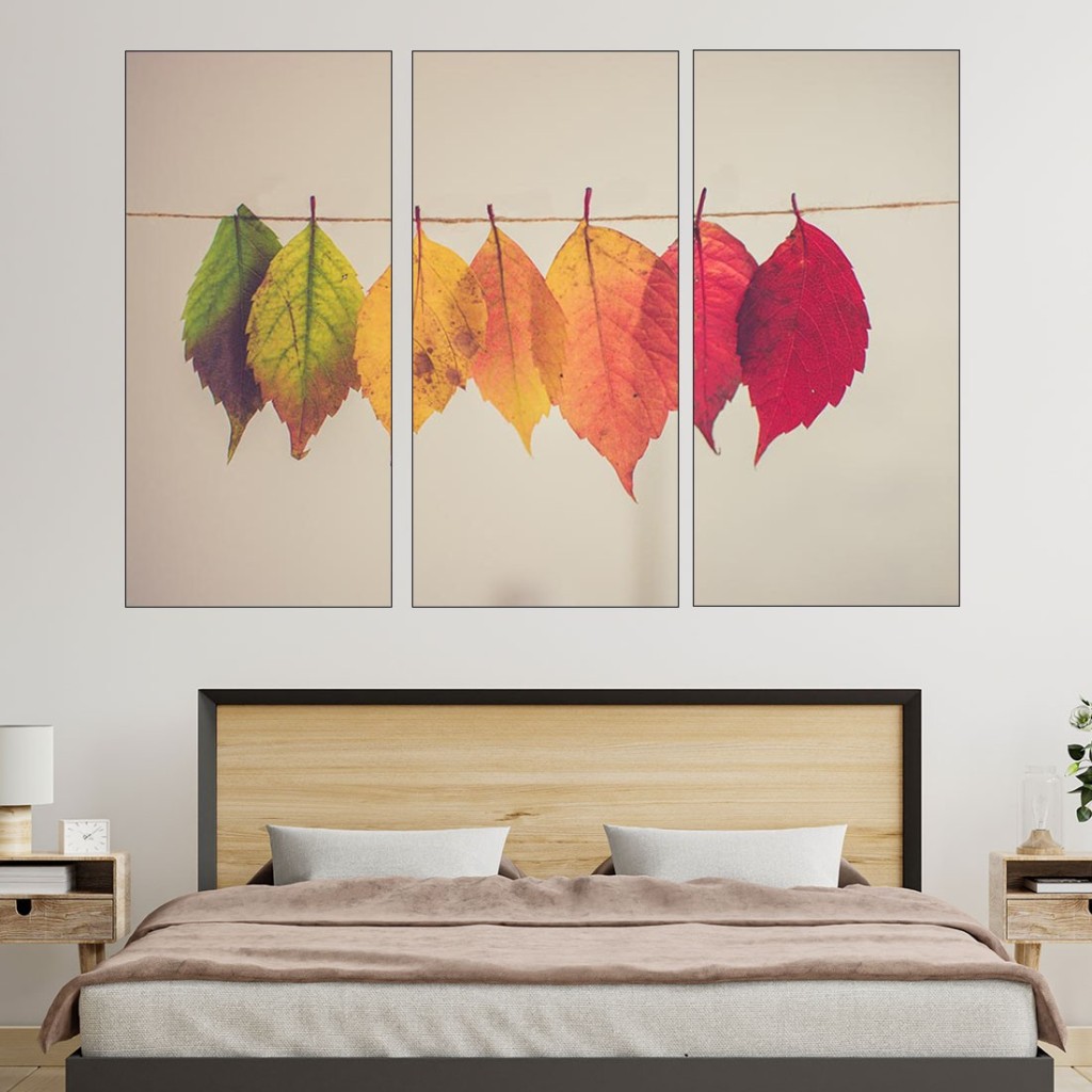 Декорация за стена (картина, пано) с мотив "Есенни листа на въже - картина пано за стена". Изработена от олекотено PVC с дебелина 5 мм или канава от 100% памук, опъната върху дървена подрамка с дебелина 5 см. Изображението се печата с висококачествен UV печат, което е гаранция за запазване на цветовете с години!