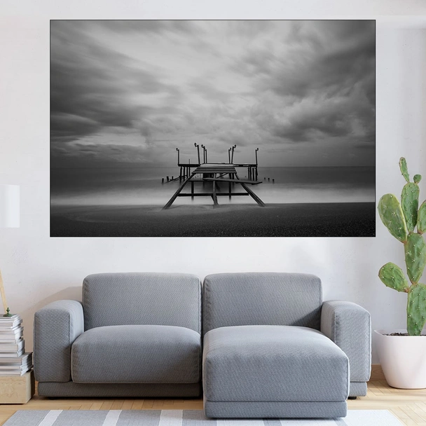 Декорация за стена (картина, пано) с мотив "Пуст кей в морето - картина пано за стена". Изработена от олекотено PVC с дебелина 5 мм или канава от 100% памук, опъната върху дървена подрамка с дебелина 5 см. Изображението се печата с висококачествен UV печат, което е гаранция за запазване на цветовете с години!