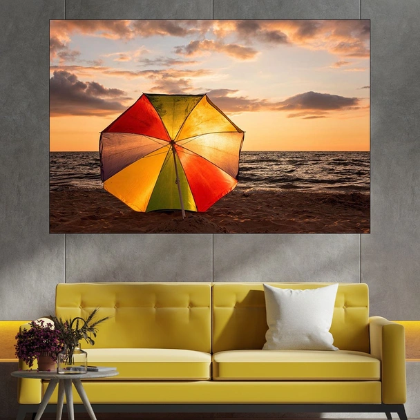 Декорация за стена (картина, пано) с мотив "Шарен чадър на пясъка - картина пано за стена". Изработена от олекотено PVC с дебелина 5 мм или канава от 100% памук, опъната върху дървена подрамка с дебелина 5 см. Изображението се печата с висококачествен UV печат, което е гаранция за запазване на цветовете с години!