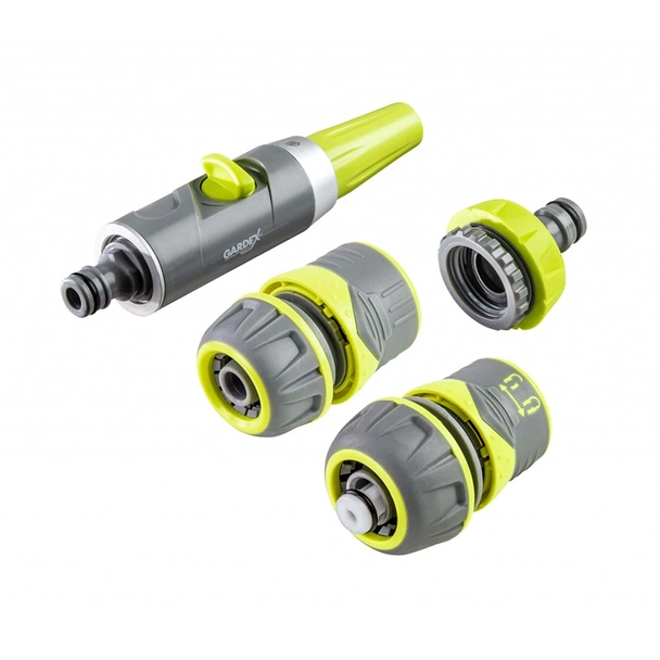 Комплектът за поливане включва регулируем струйник с клапан, адаптер към кран с вътрешна резба 3/4" / 1" и два конектора за маркуч 1/2" към бърза връзка (1 бр. със стопер и 1 бр. без стопер) със заключваща функция срещу случайно разкачване.