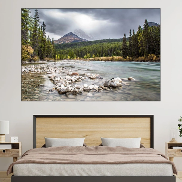 Декорация за стена (картина, пано) с мотив "На брега на река в гората - картина пано за стена". Изработена от олекотено PVC с дебелина 5 мм или канава от 100% памук, опъната върху дървена подрамка с дебелина 5 см. Изображението се печата с висококачествен UV печат, което е гаранция за запазване на цветовете с години!
