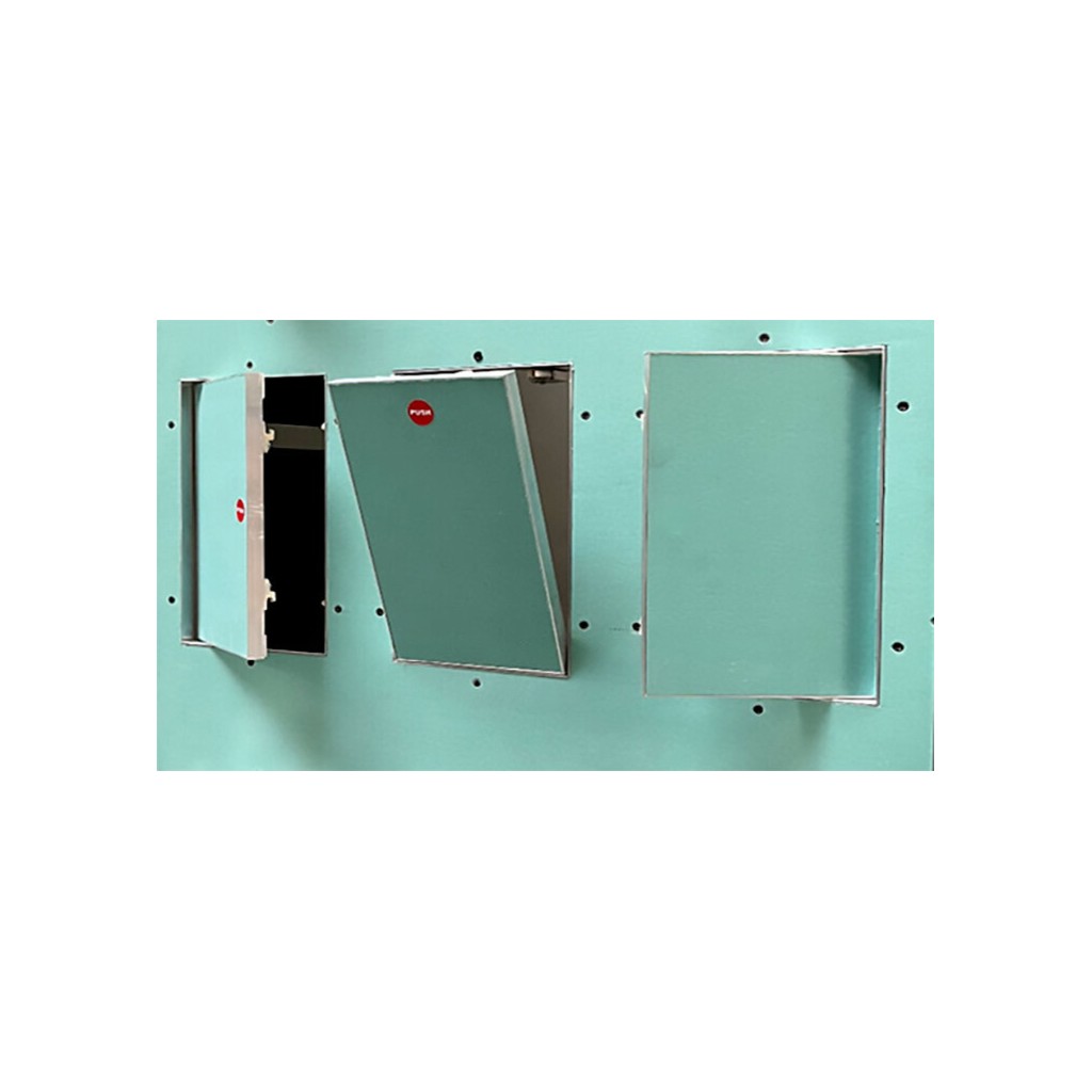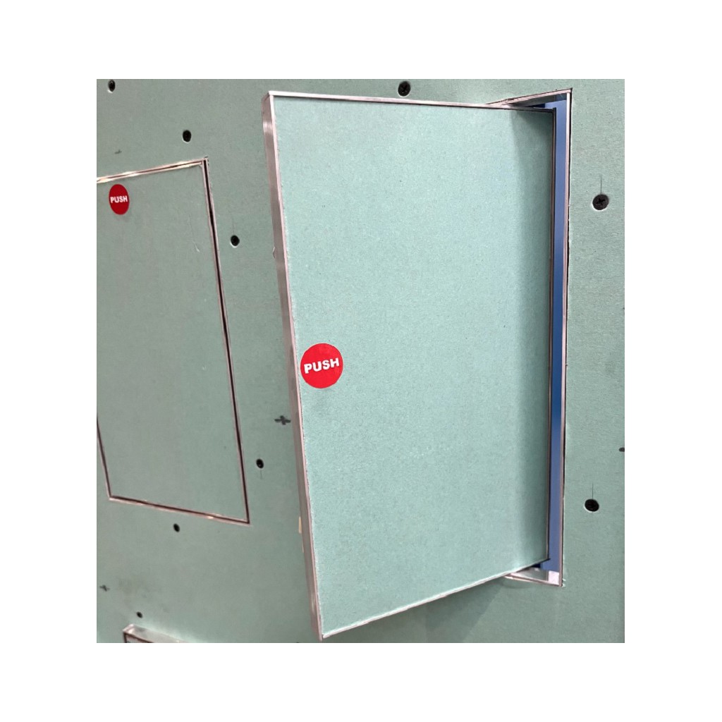 Моделът е предназначен за вграден монтаж на стена, при който видима остава само фината фуга около отвора. Стабилната алуминиева рамка осигурява надеждна конструкция, а вграденият влагоустойчив гипсокартон GKBI с дебелина 12.5 мм прави вратичката подходяща дори за помещения с по-висока влажност. Push механизмът осигурява лесно отваряне напред с лек натиск, без дръжки и допълнителни елементи, които да развалят цялостната визия.