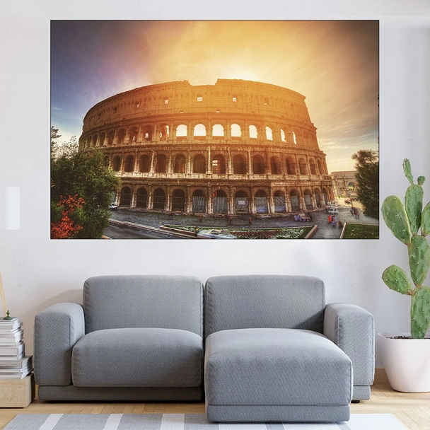 Декорация за стена (картина, пано) с мотив "Колизеума привечер в древен Рим - картина пано за стена". Изработена от олекотено PVC с дебелина 5 мм или канава от 100% памук, опъната върху дървена подрамка с дебелина 5 см. Изображението се печата с висококачествен UV печат, което е гаранция за запазване на цветовете с години!