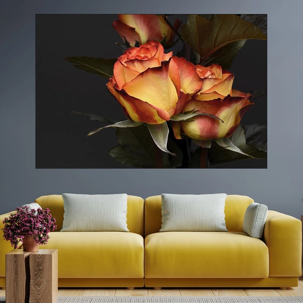 Декорация за стена (картина, пано) с мотив "Жълто-червени рози - картина пано за стена". Изработена от олекотено PVC с дебелина 5 мм или канава от 100% памук, опъната върху дървена подрамка с дебелина 5 см. Изображението се печата с висококачествен UV печат, което е гаранция за запазване на цветовете с години!