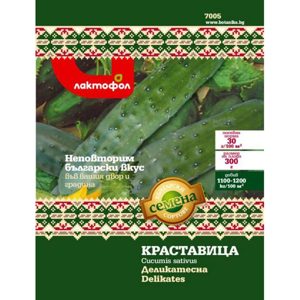 Семена Деликатесна краставица на марката ЛАКТОФОЛ БОТАНИКА, подходящи за сеитба на открито през март - април.