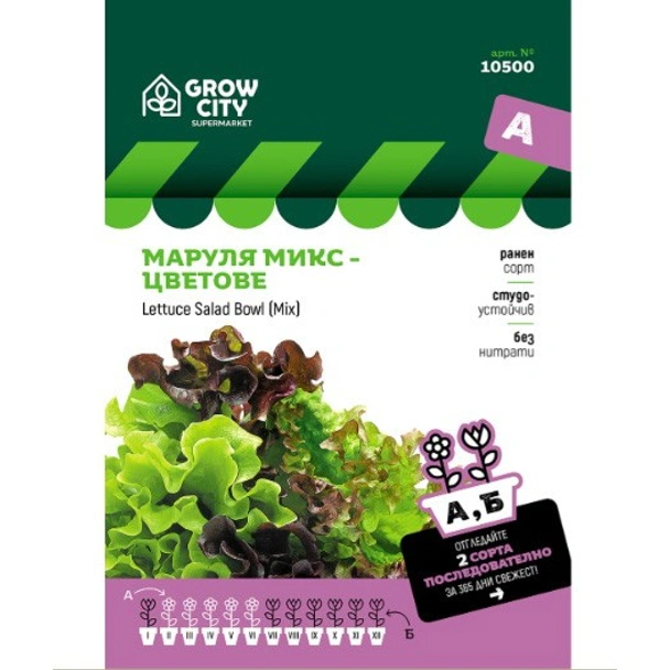 Семена Маруля микс цветове на марката GROW CITY, подходящи за сеитба на открито през февруари - май, а за беритба през април - юли.