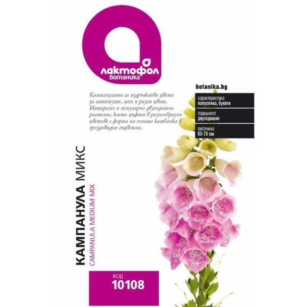 Семена за цветя Кампанула микс на марката ЛАКТОФОЛ БОТАНИКА, подходящи за сеитба на открито през март - май.