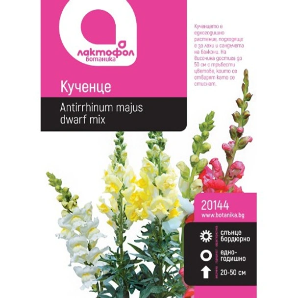 Семена за цветя Кученце на марката ЛАКТОФОЛ БОТАНИКА, подходящи за сеитба на открито през февруари - май и септември - октомври.