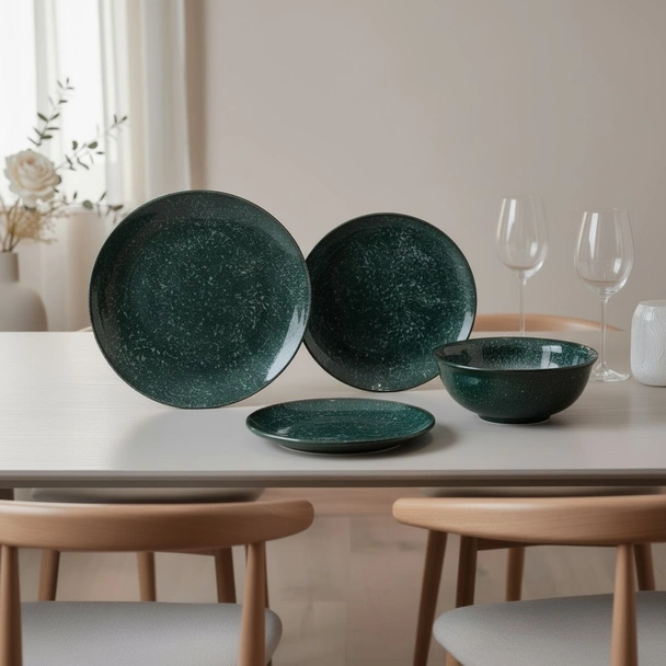 Сервизът предлага смел и характерен външен вид благодарение на наситения смарагдово-зелен цвят, допълнен от декоративни петна и фини пръски. Тъмният кант подчертава артистичната визия и придава усещане за ръчна изработка. Този цветови и текстурен контраст създава изключително природно, топло и луксозно настроение, което ще обогати всяка трапеза.