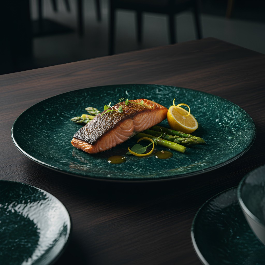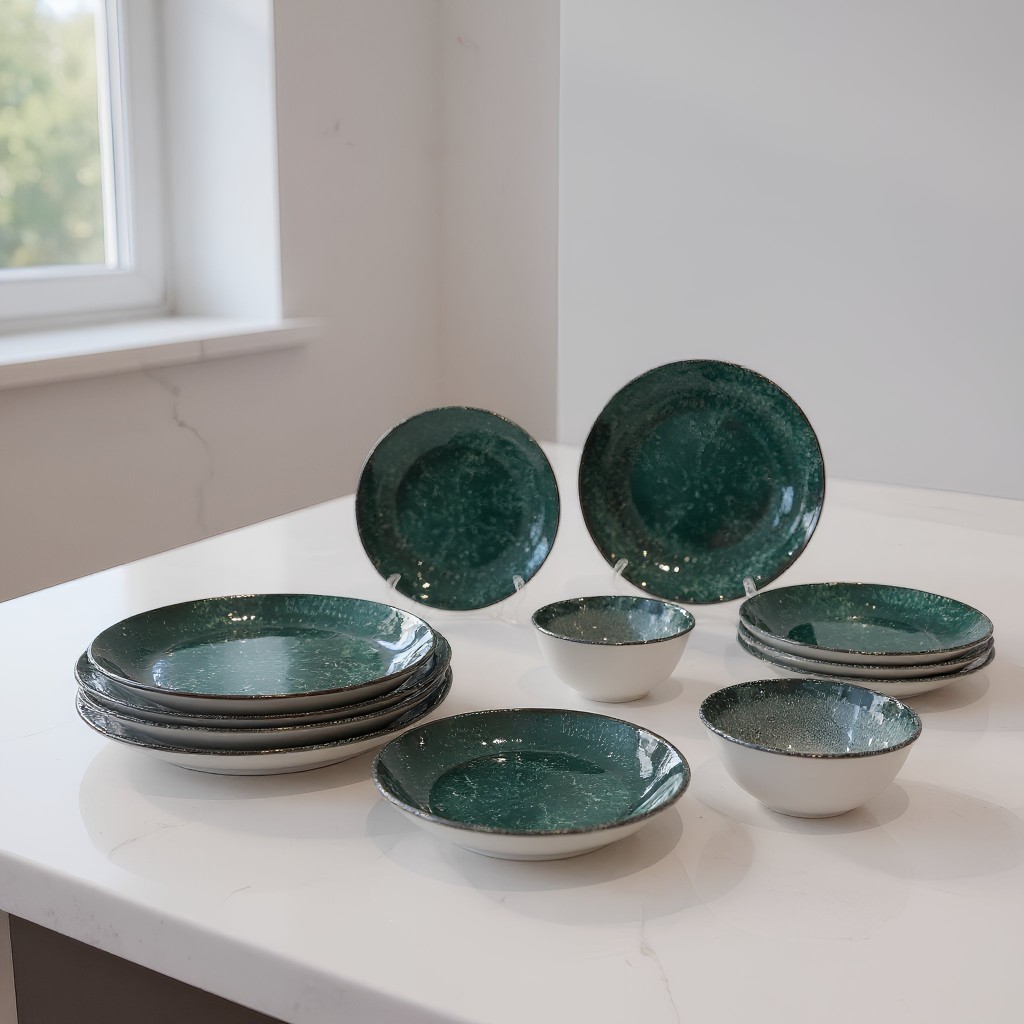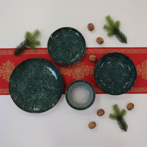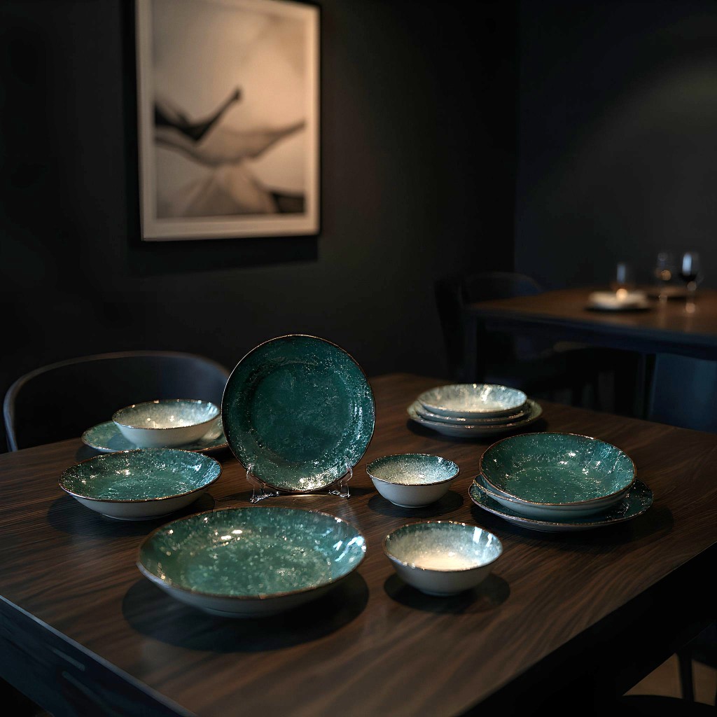 Сервизът предлага смел и характерен външен вид благодарение на наситения смарагдово-зелен цвят, допълнен от декоративни петна и фини пръски. Тъмният кант подчертава артистичната визия и придава усещане за ръчна изработка. Този цветови и текстурен контраст създава изключително природно, топло и луксозно настроение, което ще обогати всяка трапеза.