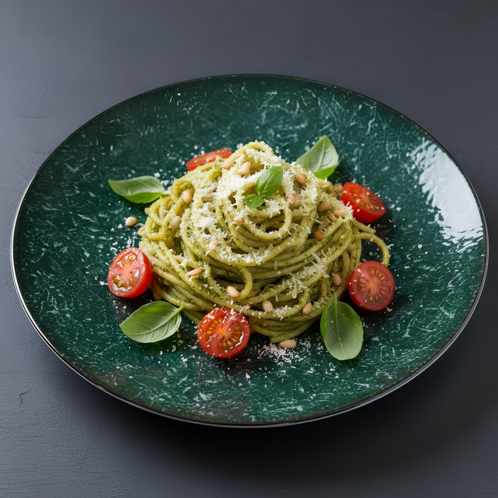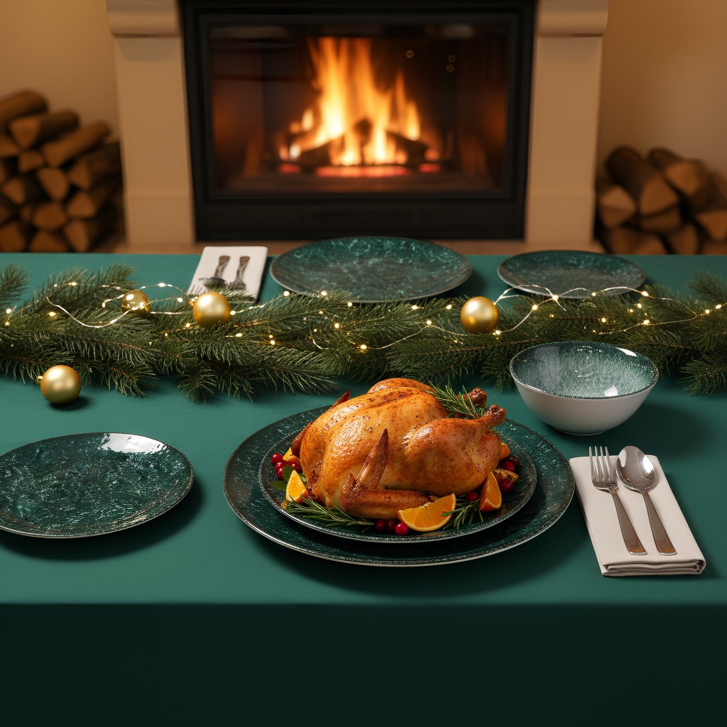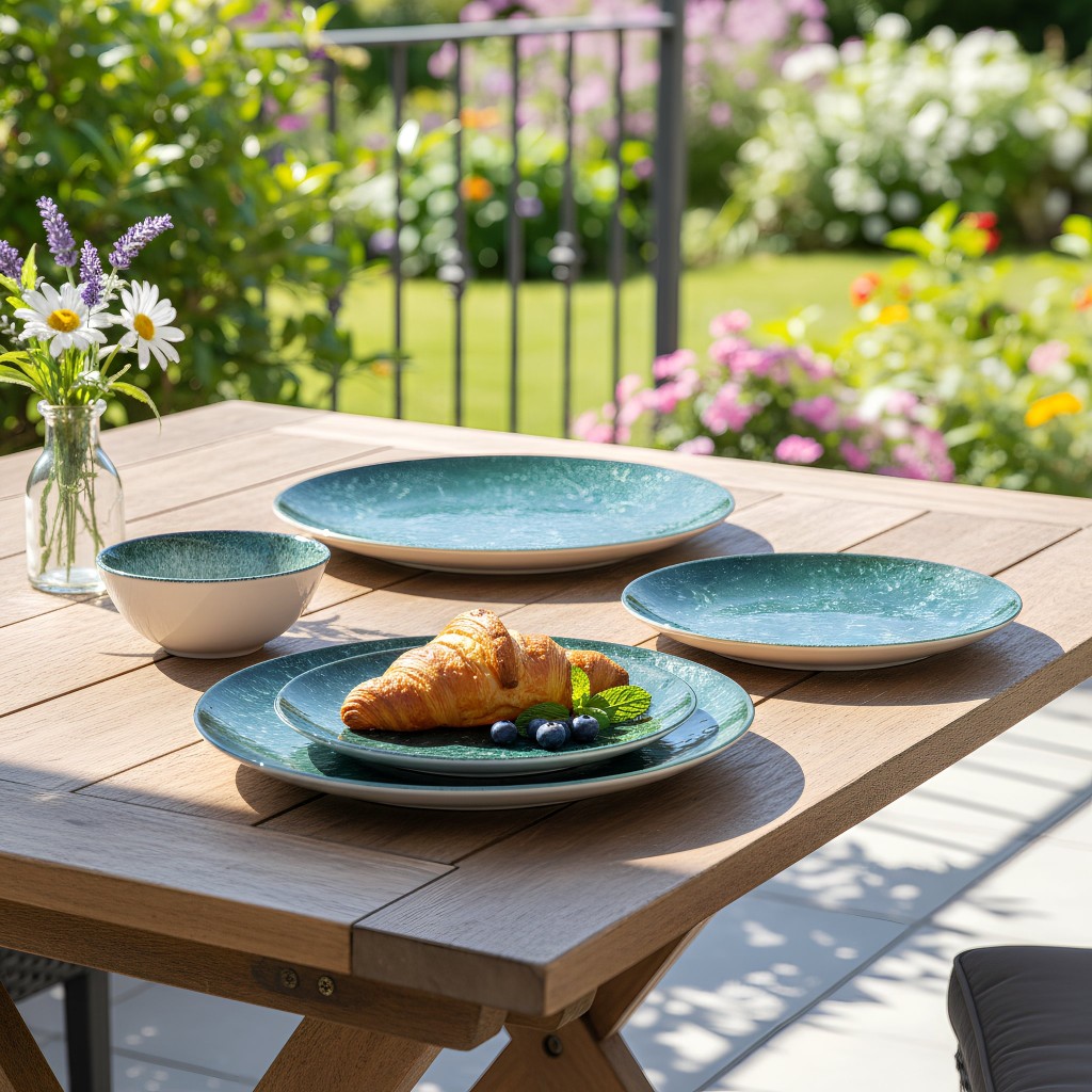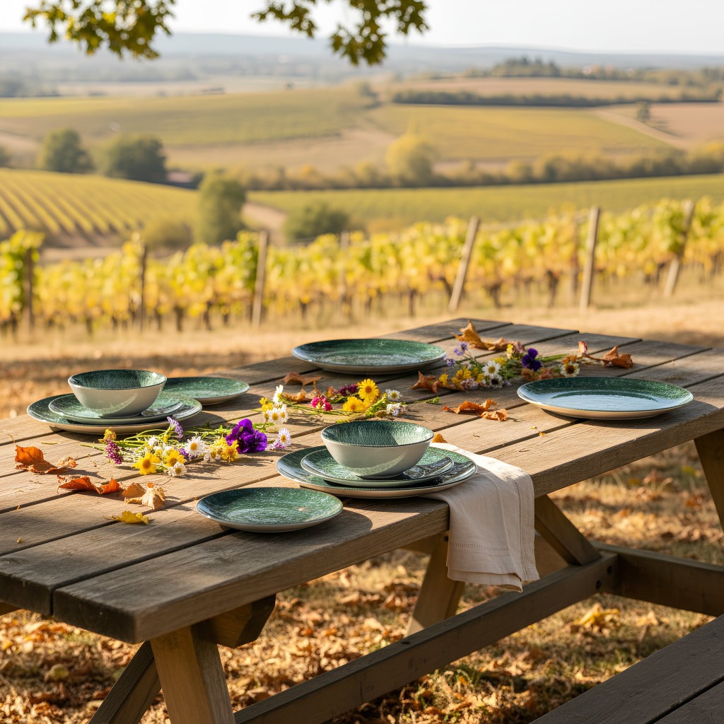 Сервизът предлага смел и характерен външен вид благодарение на наситения смарагдово-зелен цвят, допълнен от декоративни петна и фини пръски. Тъмният кант подчертава артистичната визия и придава усещане за ръчна изработка. Този цветови и текстурен контраст създава изключително природно, топло и луксозно настроение, което ще обогати всяка трапеза.