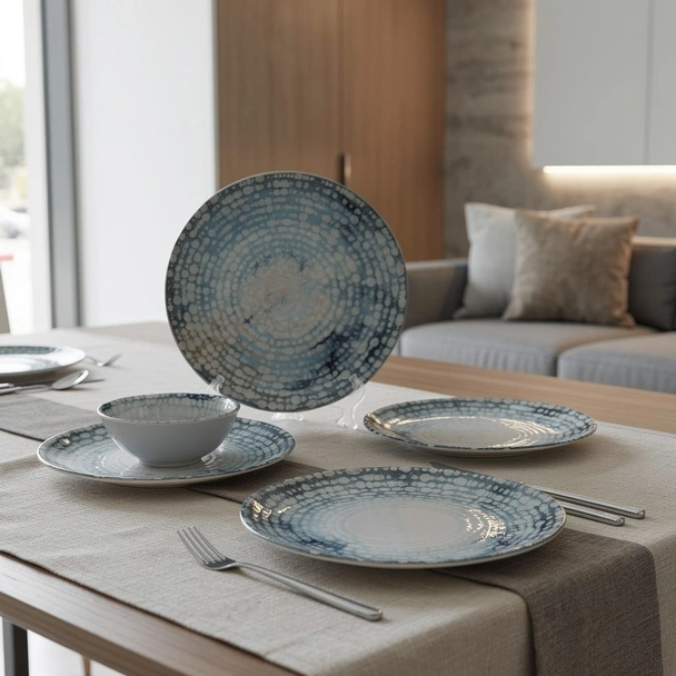 Порцелановият сервиз за хранене Мозайка от 24 части на турския производител TOPRAKSAN впечатлява с артистичен дизайн и модерна визия. Отличава се с концентрични кръгове, оформени чрез фина точкова шарка в синя гама, която създава усещане за дълбочина, плавно движение и изящна хармония. Ефектът напомня мозайка, водни пръски или пясъчен часовник, превръщайки всяко хранене във визуално удоволствие.