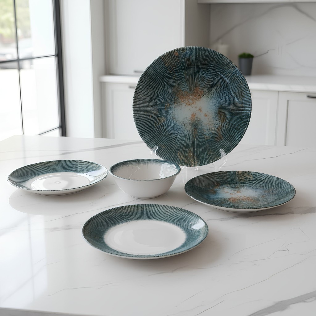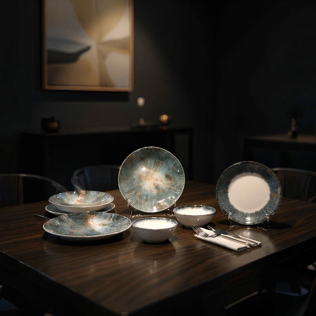 Декорацията на съдовете напомня за текстура и цветове, свързани със земното кълбо, което прави сервиза не просто домакински комплект, а истински акцент в кухнята и трапезарията. Перфектно балансираният контраст между нежната вътрешност и артистичния външен рисунък създава впечатляващ визуален ефект. Порцеланът е здрав, устойчив и създаден за дълготрайна употреба.