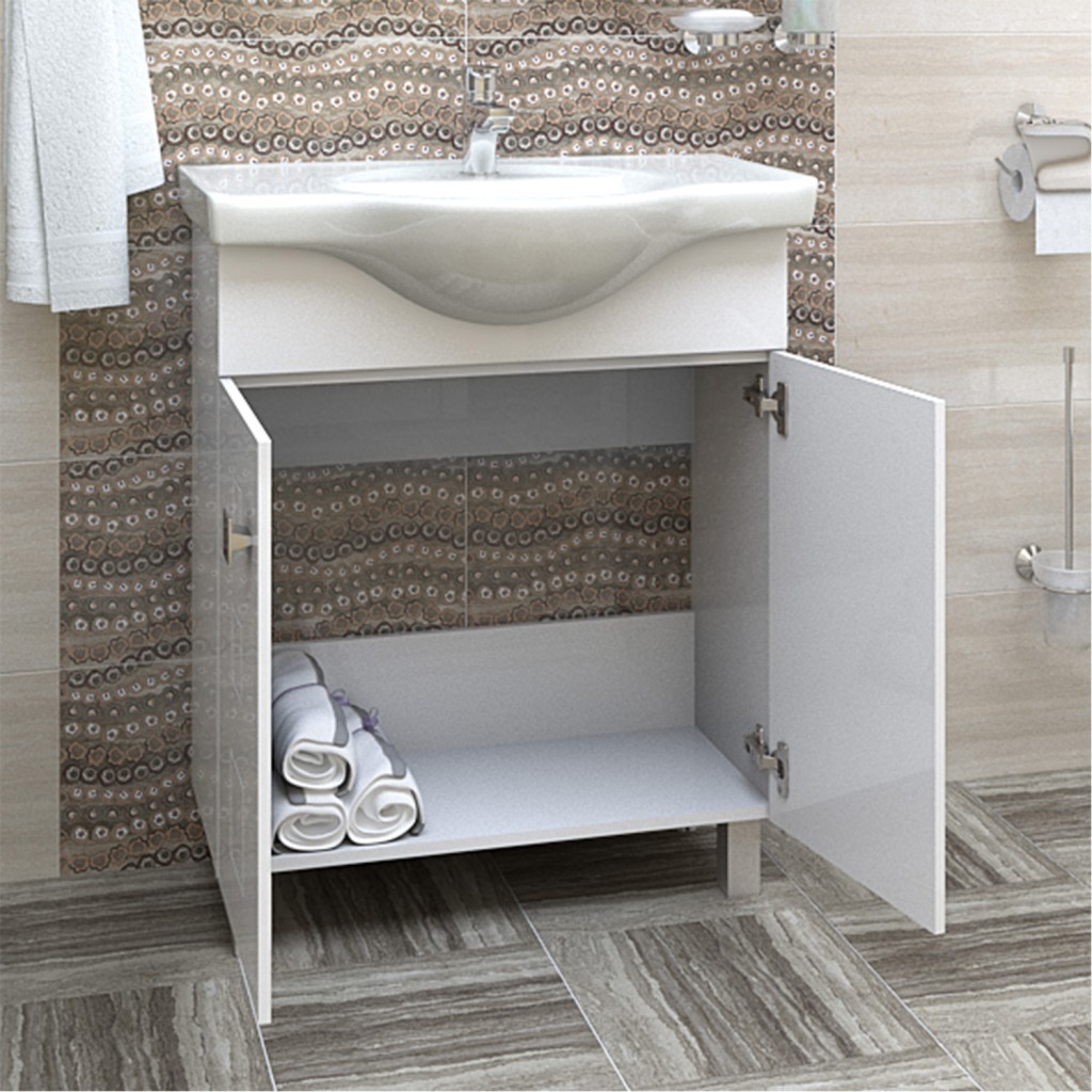 Долният шкаф разполага с две врати, които осигуряват удобен достъп до вътрешното пространство. То е подходящо за съхранение на почистващи препарати, козметика, резервни кърпи и други необходими аксесоари за банята. Механизмът за плавно затваряне предпазва вратите от рязко хлопване и удължава живота на пантите.