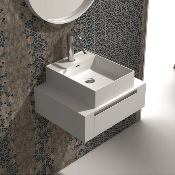Шкафът е предназначен за стенен монтаж, което не само придава модерен, издигнат вид, но и улеснява почистването на пода под него. Основната част е изработена от здрав PVC материал, известен със своята устойчивост на влага и вода. За разлика от традиционните мебели, този шкаф няма да се деформира или подуе с времето. Вградената мивка е изработена от полимермраморен камък с елегантно матирано покритие, което я прави лесна за поддържане и изключително приятна на допир. Матовият финиш придава стил и изтънченост на цялостната визия на шкафа.