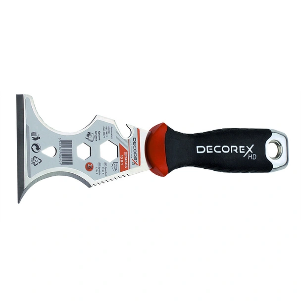 DECOREX HD предлага изключителни възможности за монтаж и демонтаж. С нейна помощ можете бързо да премахвате малки пирончета от стената или да забивате такива, използвайки здравата задна част на дръжката като чук. Острият ѝ връх влиза в ролята на отвертка за отвиване на винтове или премахване на дюбели, а здравината на острието я прави подходяща за демонтаж на первази. Назъбената част е специално проектирана за рязане на гипсокартон, а вграденият нож е пръв помощник при отваряне на кашони, рязане на въжета, фолио и други опаковъчни материали.