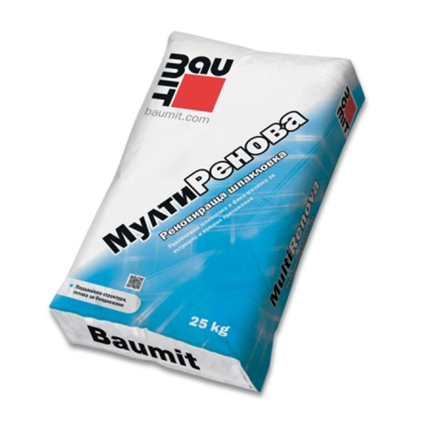 Обогатена шпакловка и фина мазилка в едно МултиРенова на марката BAUMIT, особено подходяща за реновиране.