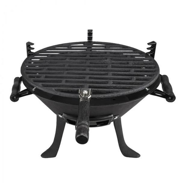 Скарата също е изработена от чугун и може да се регулира на височина, което ви дава пълен контрол върху процеса на готвене. Независимо дали искате да запечатате пържола на силен огън или да печете бавно, регулируемата скара ви позволява да адаптирате температурата според нуждите си. За ваше удобство и безопасност, барбекюто е снабдено с дръжки от дърво, които остават хладни по време на готвене, предпазвайки ви от изгаряне.