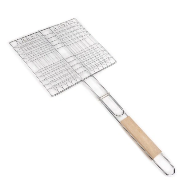 Скарата е изработена от здрав метал, който е устойчив на високи температури и гарантира дълготрайна употреба. Размерът ѝ е 22.5х20.5 см, което я прави подходяща за приготвяне на месо, зеленчуци и други храни. Едно от основните предимства е дървената дръжка, която не се нагрява по време на готвене. Това ви позволява безопасно и удобно да обръщате храната, без да се притеснявате от изгаряния. С обща дължина от 52 см, скарата е достатъчно дълга, за да ви предпази от горещината, докато работите.