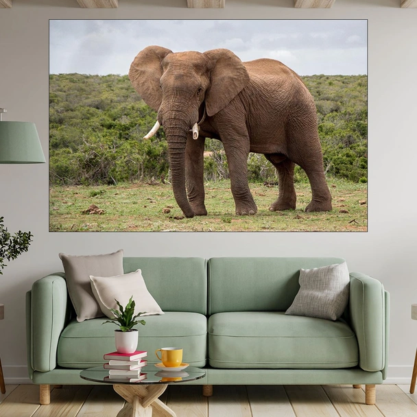 Декорация за стена (картина, пано) с мотив "Африкански слон в саваната - картина пано за стена". Изработена от олекотено PVC с дебелина 5 мм или канава от 100% памук, опъната върху дървена подрамка с дебелина 5 см. Изображението се печата с висококачествен UV печат, което е гаранция за запазване на цветовете с години!