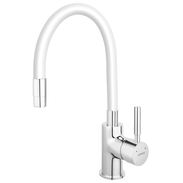 Смесителят за кухня Zumba от Ferro е едно от най-иновативните и практични решения за съвременното домакинство. Този модел излиза извън рамките на традиционния дизайн, предлагайки изключителна гъвкавост благодарение на своя характерен бял PVC чучур. Той е проектиран за активни потребители, които търсят максимално удобство в кухнята – от лесното измиване на обемни тави до прецизното почистване на труднодостъпни ъгли в мивката. Белият цвят на чучура, съчетан с хромираното тяло, придава модерен и свеж вид на интериора.