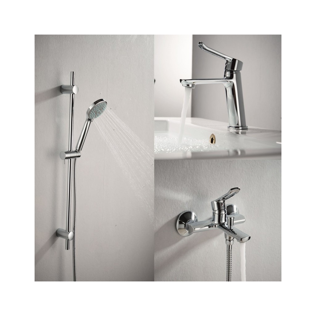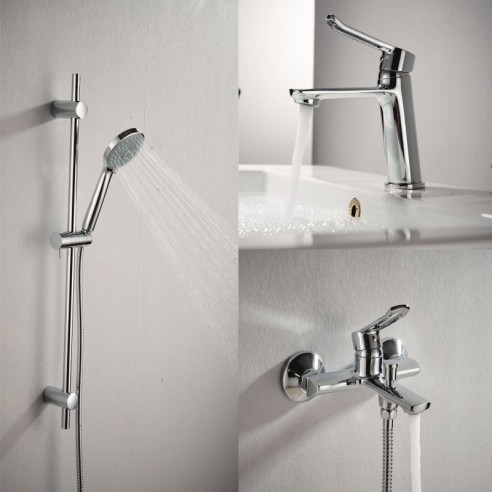 - Включени компоненти: Стоящ смесител за умивалник, стенен смесител за душ, душ слушалка, шлаух, статив