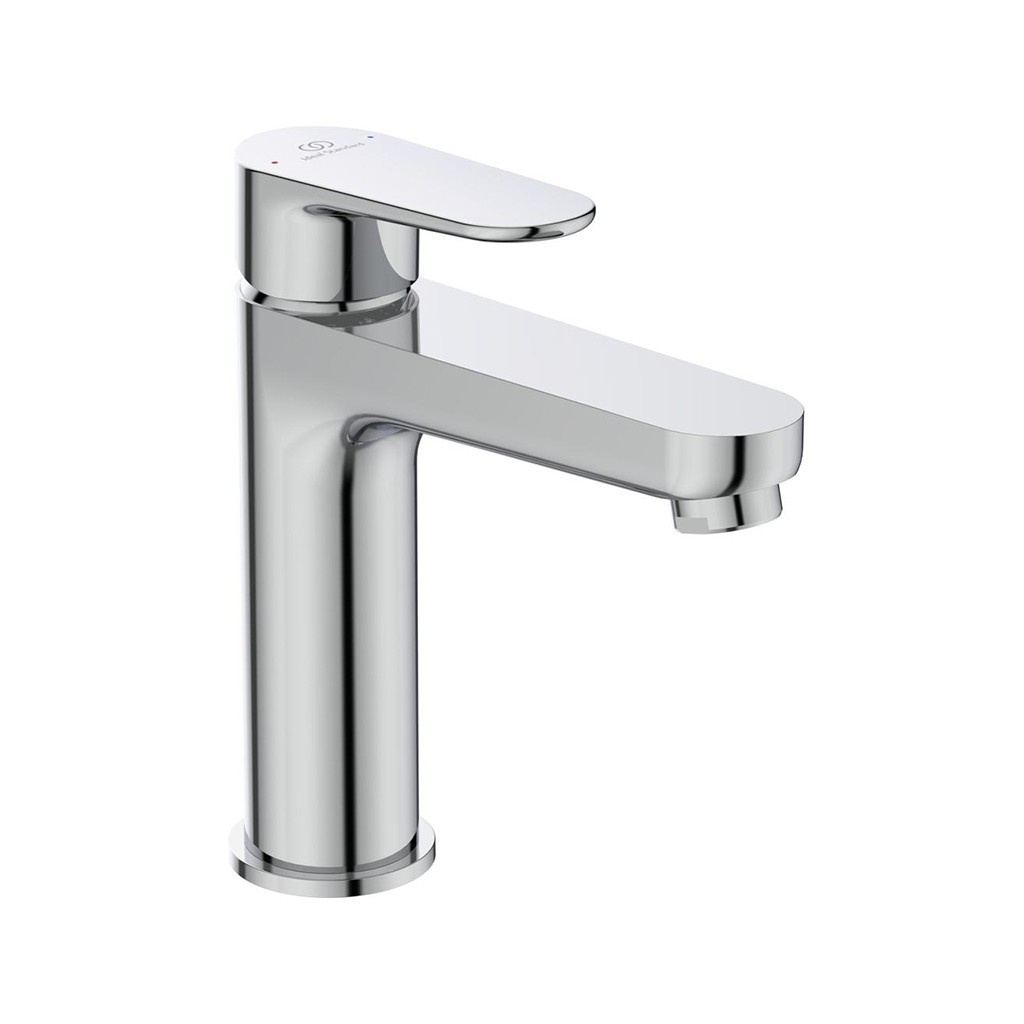 Смесителят е едноръкохватков, като металната ръкохватка е здрава и удобна, с ясен индикатор за топла и студена вода.