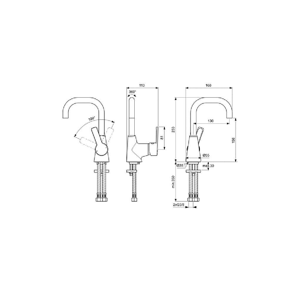 - Гъвкави връзки G3/8": Включени са за сигурно и лесно присъединяване към водопроводната инсталация.