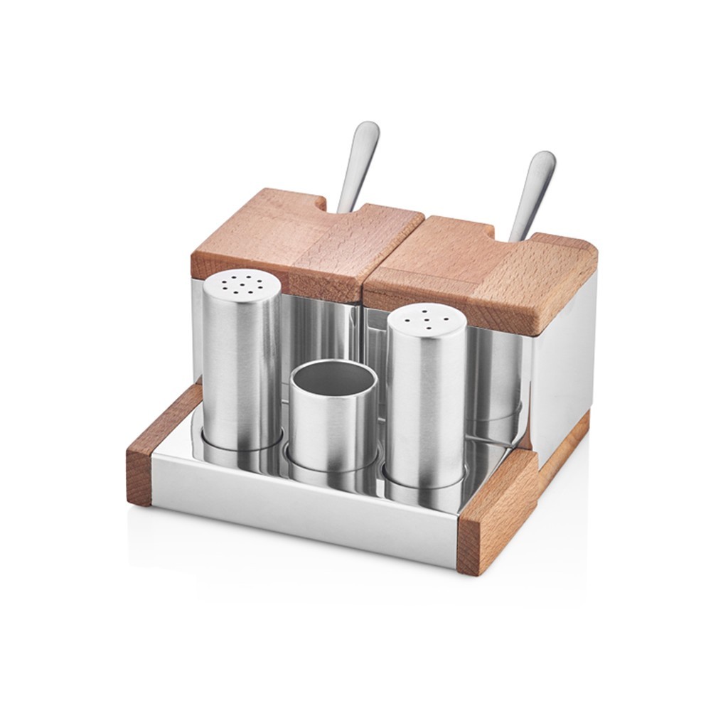 - Съдържание: 1 солничка, 1 пиперничка, контейнер за клечки за зъби, 2 съда за подправки с лъжички