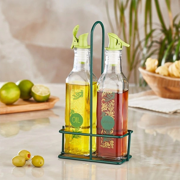 Метален оливерник в зелен цвят на марката HANE с два стъклени съда - за олио и оцет.