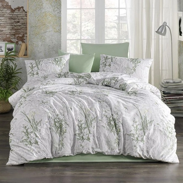 Единичен спален комплект от 3 части на турската марка ZAMBAK с флорални мотиви в бяло и зелено, изработен от 100% памук.